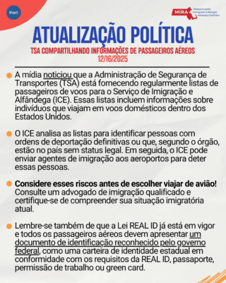 A mídia noticiou que a Administração de Segurança de Transportes (TSA) está fornecendo regularmente listas de passageiros de voos para o Serviço de Imigração e Alfândega (ICE). Essas listas incluem informações sobre indivíduos que viajam em voos domésticos dentro dos Estados Unidos.