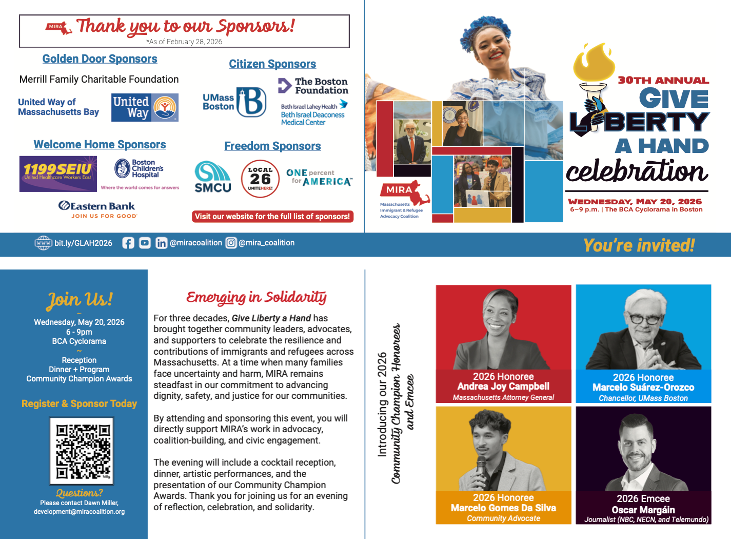 Join MIRA Coalition for the 30th annual Give Liberty a Hand celebration on Wednesday, May 20, 2026 at 6:00 p.m. at the historic BCA Cyclorama in Boston.